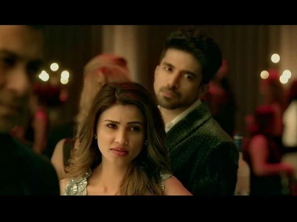 A scene from Race 3 where Daisy Shah says ” Our Business is Our Business, None of Your Business.”