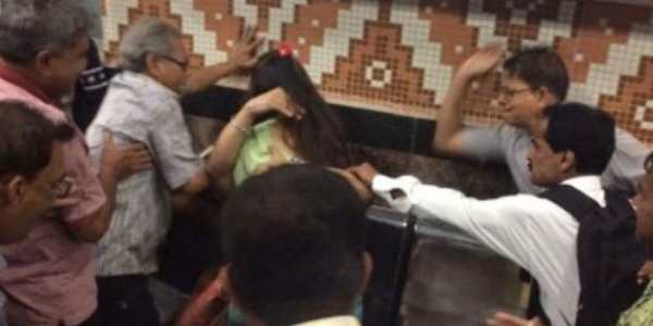 The couple being beaten in Kolkota Metro for hugging each other.